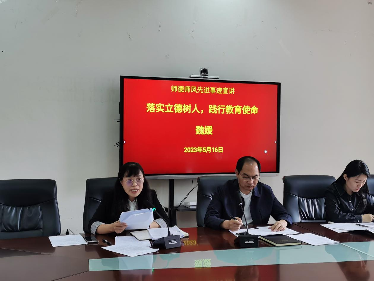 接下来副经理魏媛作师德先进事迹宣讲。作为贵州省巾帼建功标兵、伟德国际1946“四有”好老师、“三八红旗手”、优秀教师、教书育人楷模,魏媛向全院教职工分享了她的先进事迹和工作经验,并引导教职工以德立身、以德立学、以德施教。