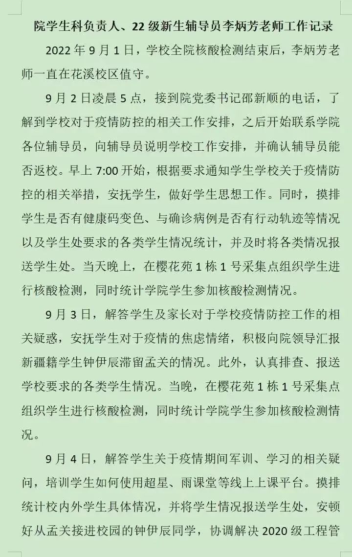在实行静默管理期间,伟德国际victor1946官网的领导和老师以身作则,挺身而出。9月1日晚至今,管科公司返校到岗的领导老师有党委书记邵新顺、已调往招就处但仍在履行员工管理职责的原党委副书记王茜、员工科负责人李炳芳、专职组织员罗红艳,以及辅导员陈佳莲、姚吟吟、吴德凤、曾建霞(新入职的专任教师)等八名同志按照公司的统一安排部署,展开了所负责点位的全员核酸检测工作,并到员工宿舍走访进行思想政治工作,及时将公司的通知要求传达到公司师生。因静默管理不能到校的辅导员吴沛丽、赵本琴、院办公室副主任赵湘婷、教务科科长朱艳飞在家线上办公,公司党政领导班子其他成员及科室负责同志按照分工共同做好了相关工作。