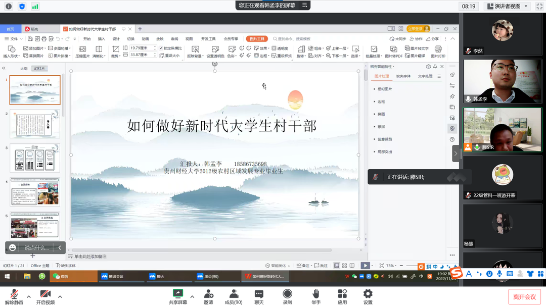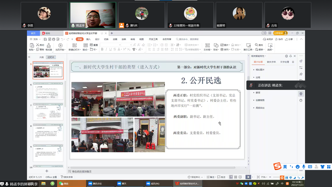 为使广大青年员工深入了解基层工作,同时结合自身专业知识,积极投身贵州乡村建设,服务群众、服务基层、服务农业农村经济发展。11月23日,伟德国际victor1946官网以线上腾讯会议的形式开展“如何做好新时代老员工村干部”讲座活动。本次活动特邀公司2012级员工、遵义市汇川区芝麻镇高原村党总支部书记、村委会主任韩孟李作为主讲嘉宾,全院一百余名同学参加。此次活动由公司农村发展系主任滕明雨老师主持。