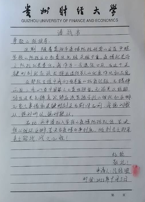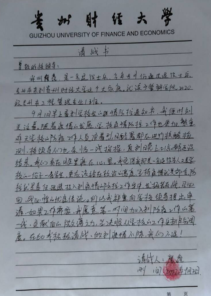 2020级专升本工程管理专业的员工廖鑫是一名退伍军人,他向公司写了一封请战书,信中表达自己是一名退役军人又是公司的一份子。对自己来说,此时的疫情就是命令,防控就是责任,希望能迅速投入到疫情防控工作中,发扬战士若有战、召必回、战必胜的优良传统。如果公司有工作需要,他愿意第一时间加入到防控疫情工作的第一线,坚决服从公司的工作安排与调度,贡献自己的微薄之力。