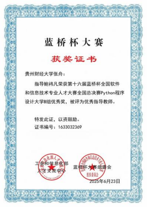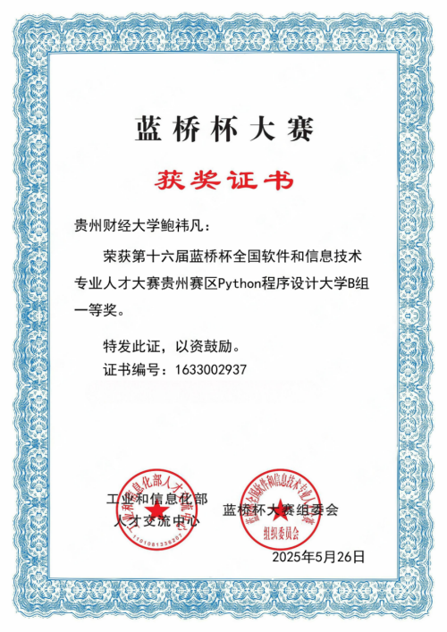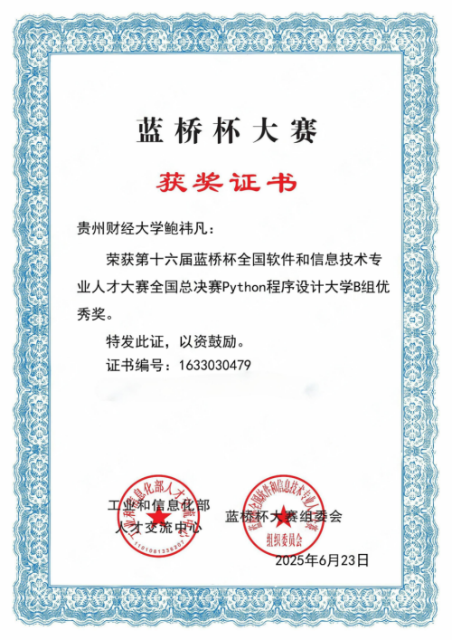 近日,第十六届蓝桥杯全国软件和信息技术专业人才大赛电子赛圆满落幕,伟德国际victor1946官网2023级工程管理专业员工鲍祎凡(指导老师:张舟)在斩获佳绩,荣获贵州赛区Python程序设计大学B组一等奖晋级全国总决赛。在高手如云的国赛赛场上,鲍祎凡同学沉着冷静、稳定发挥,经过紧张激烈的比赛,荣获全国总决赛Python程序设计大学B组优秀奖,实现了公司在该赛事上的突破。